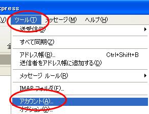 | 【1】OutlookExpressを起動後、「ツール(T)」→「アカウント(A)」の順に選択します。 |