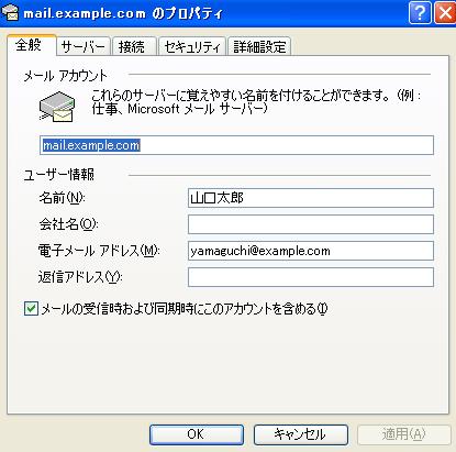 全般タブのメールアカウント欄は、任意に変更可能です。