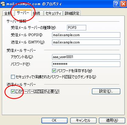 サーバタブをクリックし、送信メールサーバーの「このサーバーは認証が必要」にチェックを入れます。 |