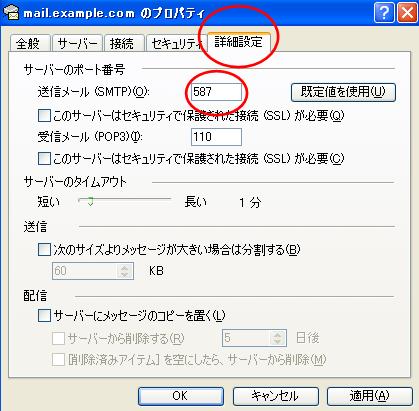 詳細設定タブをクリックし、送信メール(SMTP)欄を587に変更してください。 |