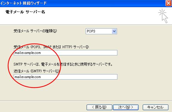 「受信メール(POP3、IMAPまたはHTTP)サーバー(I)」に、ご利用のご案内の受信(POP) 「送信メール(SMTP)サーバ(O)」に、ご利用のご案内の送信(SMTP)を入力します。