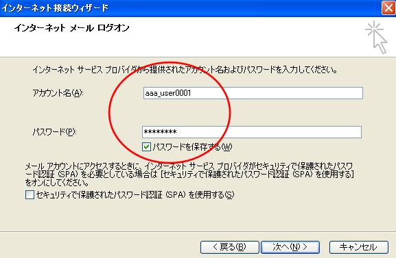 メールサーバに接続する際の、ユーザー名(アカウント名)、パスワードを設定します。