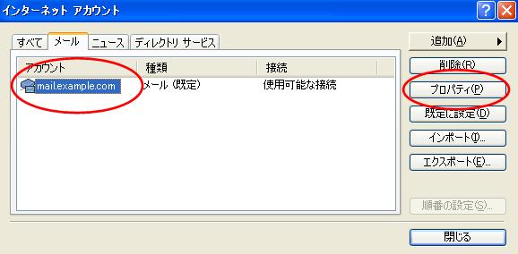【5】上記で「完了」をクリックすると、インターネットアカウントウィンドウに戻りますので、アカウント欄の設定したアカウントを選択し、右側の「プロパティ(P)」をクリックします。 |