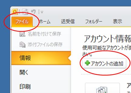 | 【1】MicrosoftOutlookを起動後、「ファイル」→「アカウントの追加」の順に選択します。 |
