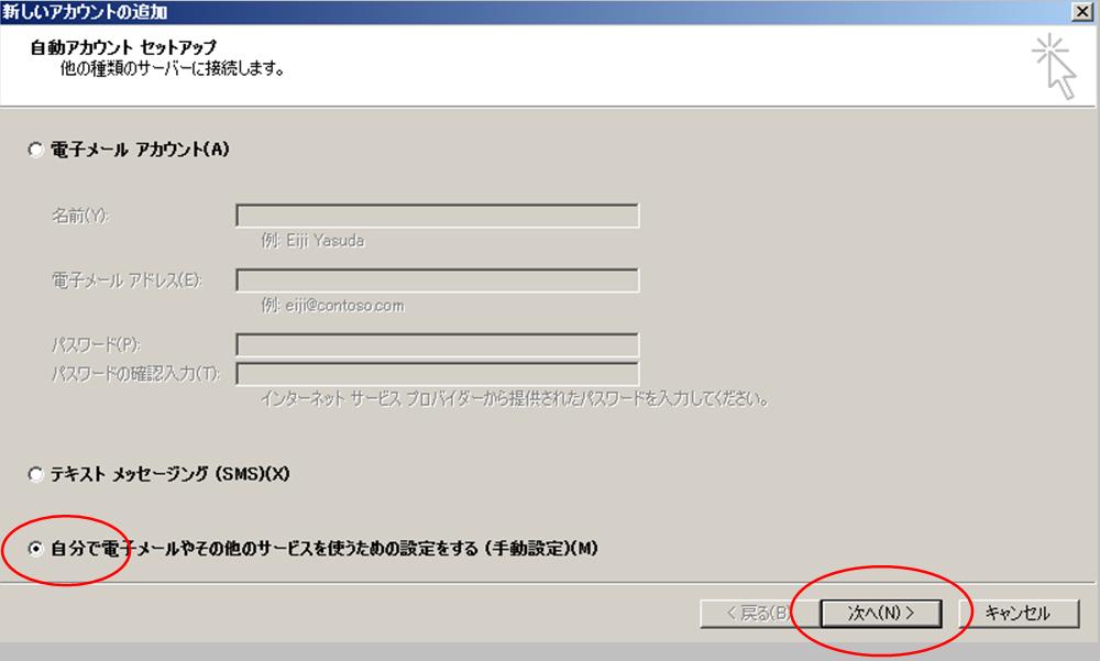 【2】新しいアカウントの追加ウィンドウが表示されたら、「自分で電子メールやその他のサービスを使うための設定をする(手動設定)(M)」をチェックし、「次へ(N)」をクリックします。 |