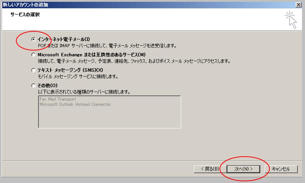 【3】「インターネット電子メール(I)」をチェックし、「次へ(N)」をクリックします。 |