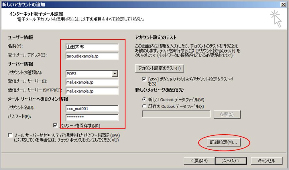 【4】「新しいアカウントの追加」が表示されたら、左側の「ユーザー情報」「サーバ情報」「メールサーバへのログオン情報」を入力し、「詳細設定」をクリックします。