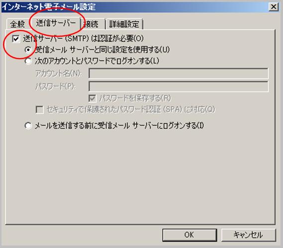 【5】「インターネット電子メール設定」が表示されたら、「送信サーバ」タブをクリックし、「送信サーバー(SMTP)は認証が必要(O)」「受信メールサーバーと同じ設定を使用する(U)」の2つを選択します。 |