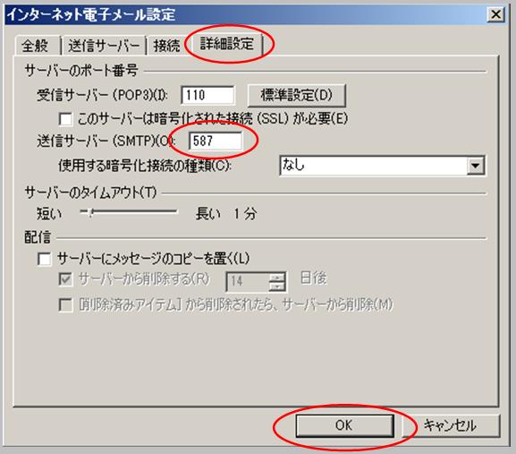 【6】「詳細設定」タブをクリックし、「送信サーバ(SMTP)(O)」を「587」に変更後、「OK」をクリックします。 |
