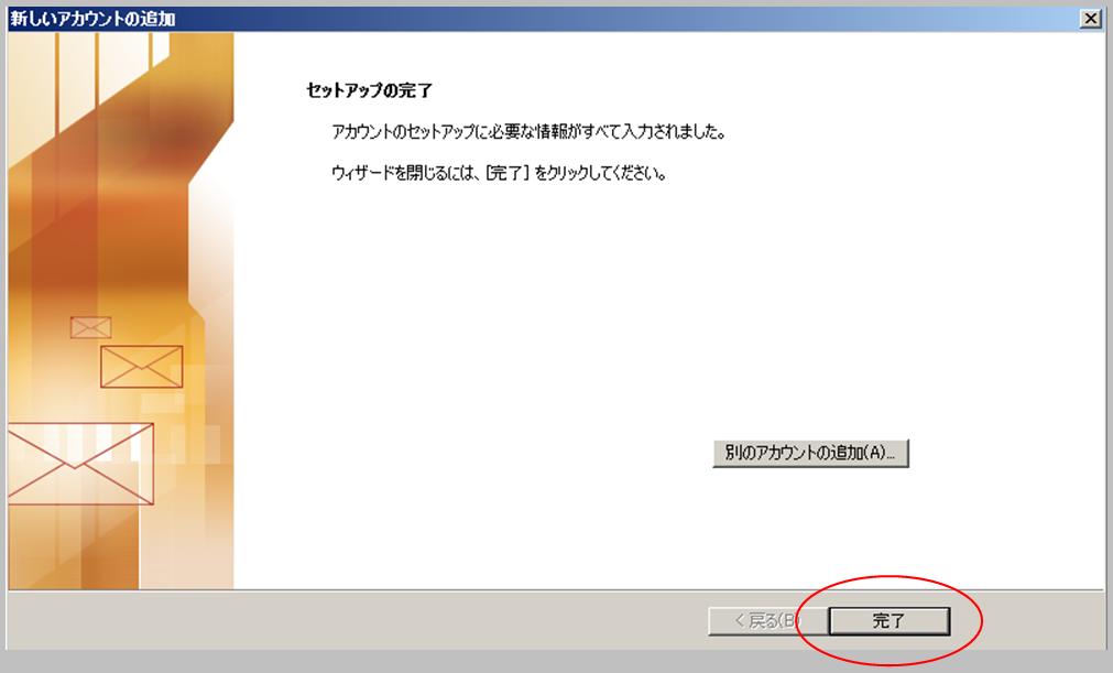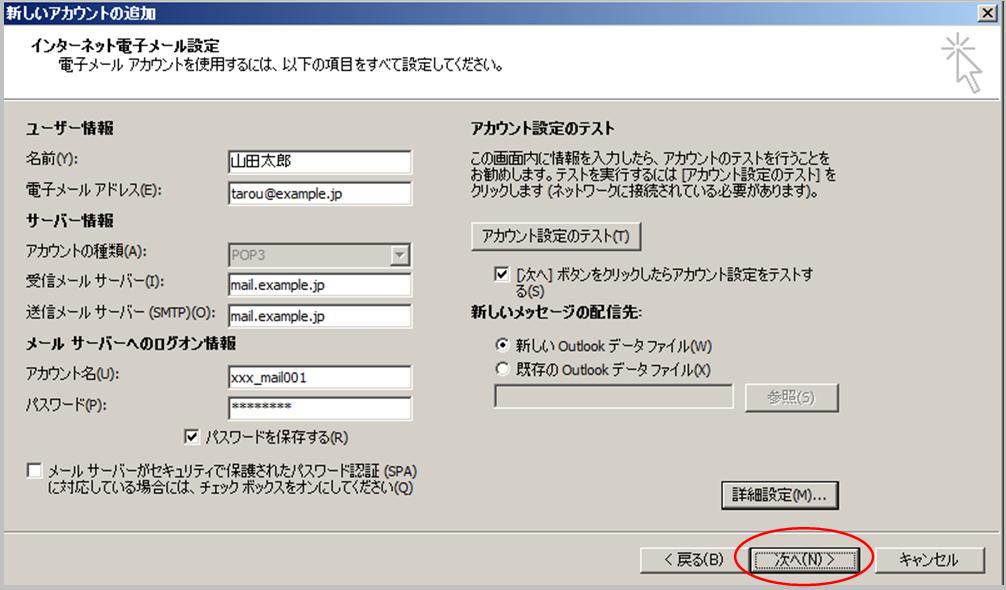 【7】「新しいアカウントの追加」に戻りますので、「次へ(N)」を選択します。 |