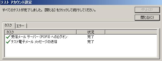 【8】「テスト アカウント設定」が表示され、設定された内容でサーバへ接続試験が行われます。 エラーが表示された場合、設定内容に誤りがありますので、確認してください。 |